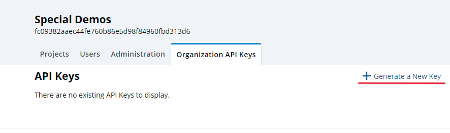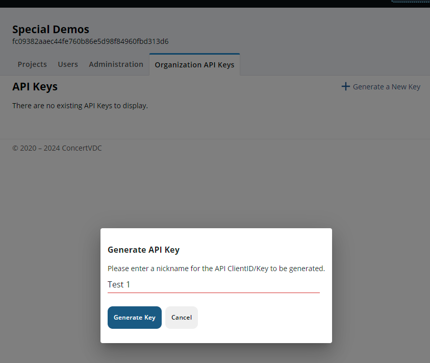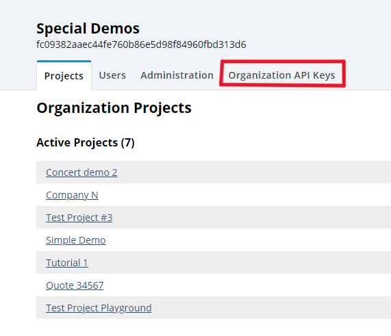 To get started setting up the API for your company, simply go to your organization page in the CONCERT platform. Here you will find a list of all the projects in your organization and the administrative tabs for managing CONCERT in your company. The far right tab is titled “Organization API Keys”. Click on this tab.