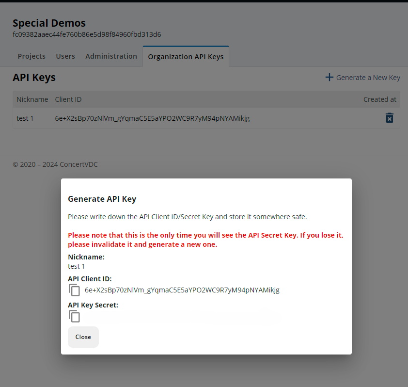 Once you have recorded your secret key for future use, press the “Close” button at the bottom of the pop-up box, and your API is now ready for your use. You will now see all the API’s you’ve generated in CONCERT in your API Keys list. If you are done with an API or you want to replace it, you can delete the API at any time by clicking on the blue trash can on the right side of the API list. Deleting the API will stop the integration; however, any information that was pulled or pushed through the API will remain in the CONCERT platform records.